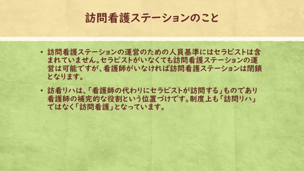 訪問看護ステーションの制度というか報酬(診療報酬や介護報酬)などの資料に記載されていますが、訪問看護ステーションからのセラピストの訪問はあくまでも「看護師の代わりに訪問する」という位置づけなんですよね。報酬的にも「訪問看護」で請求するもので、請求項目は訪問リハビリテーションではありません。